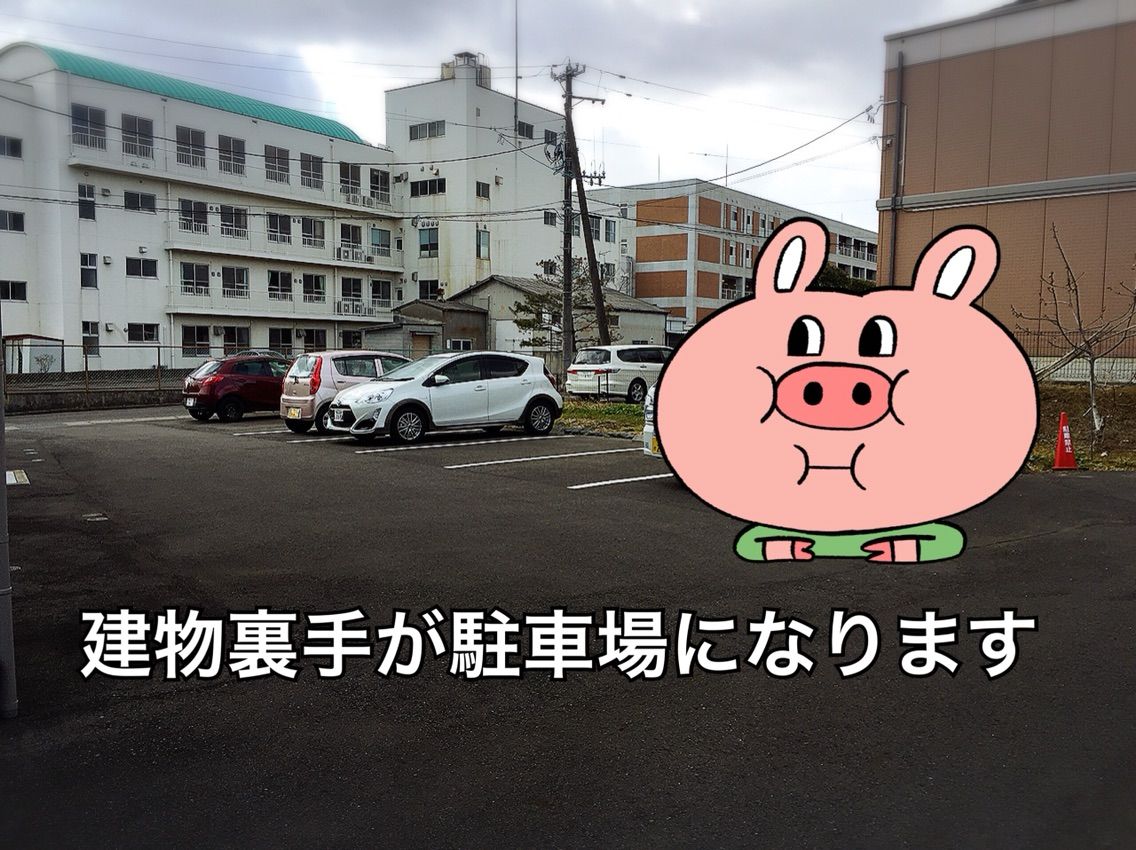桜の木の下に駐車場の看板が見えますので、左折して建物奥が駐車場となります。